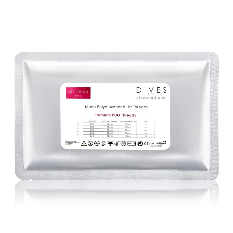 DIVES Med. Art. Grade Premium to koreńskie nici do redermalizacji i intensywnego zagęszczania skóry. Wykonane z polidioksanonu o najwyższym profilu jakości i bezpieczeństwa potwierdzonym certyfikatem medycznym CE i KFDA. DIVES Med. Art. Grade Premium to medyczne nici PDO do silnej rewitalizacji skóry. Nić zbudowana jest z pojedynczego włókna PDO zespolonego z wysokiej jakości igłą, zapewniającą bezpieczeństwo i łatwość implantacji.