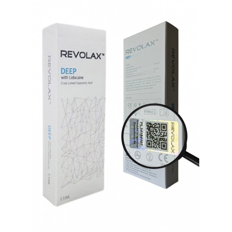 Revolax Deep Lidocaine to wypełniacz na bazie usieciowanego kwasu hialuronowego pochodzenia niezwierzęcego stosowany w wypełnieniu ust, korektach średnich i głębokich zmarszczek, korektach nosa, policzków. Plastyczna konsystencja pozwala na stworzenie natychmiastowej i trwałej objętości oraz równomierny rozkład produktu z naturalnym wykończeniem. Nowa technologia sieciowania bez czynnika BDDE